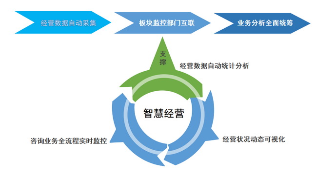平臺(tái)以“智慧經(jīng)營(yíng)”為主線,集經(jīng)營(yíng)數(shù)據(jù)自動(dòng)統(tǒng)計(jì)分析、咨詢業(yè)務(wù)全流程實(shí)時(shí)監(jiān)控、經(jīng)營(yíng)狀況動(dòng)態(tài)可視化于一體,支撐公司實(shí)現(xiàn)經(jīng)營(yíng)數(shù)據(jù)自動(dòng)采集、板塊監(jiān)控部門(mén)互聯(lián)、業(yè)務(wù)分析全面統(tǒng)籌等目標(biāo)。平臺(tái)將匯聚各類型經(jīng)營(yíng)數(shù)據(jù),按照12個(gè)維度來(lái)統(tǒng)計(jì)分析、直觀展示業(yè)務(wù)經(jīng)營(yíng)情況,對(duì)數(shù)據(jù)逐步細(xì)化、深入分析,并為科學(xué)預(yù)判未來(lái)生產(chǎn)經(jīng)營(yíng)走勢(shì)提供了可靠依據(jù)。