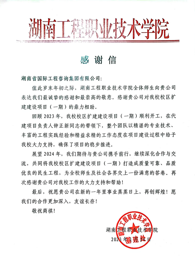 近日,湘咨集團(tuán)收到來自湖南省發(fā)展改革委、湖南工程職業(yè)技術(shù)學(xué)院發(fā)來的感謝信。信中對集團(tuán)代建項目經(jīng)理鐘正新同志及代建管理團(tuán)隊在該校校區(qū)擴建建設(shè)項目(一期)代建管理方面的專業(yè)、務(wù)實、高效給予高度贊譽,對投融資與戰(zhàn)略咨詢事業(yè)部蔡丹丹同志積極協(xié)助配合美麗中國評估組在湘聯(lián)絡(luò)協(xié)調(diào)、開展環(huán)境基礎(chǔ)設(shè)施摸底調(diào)查等工作給予充分肯定。